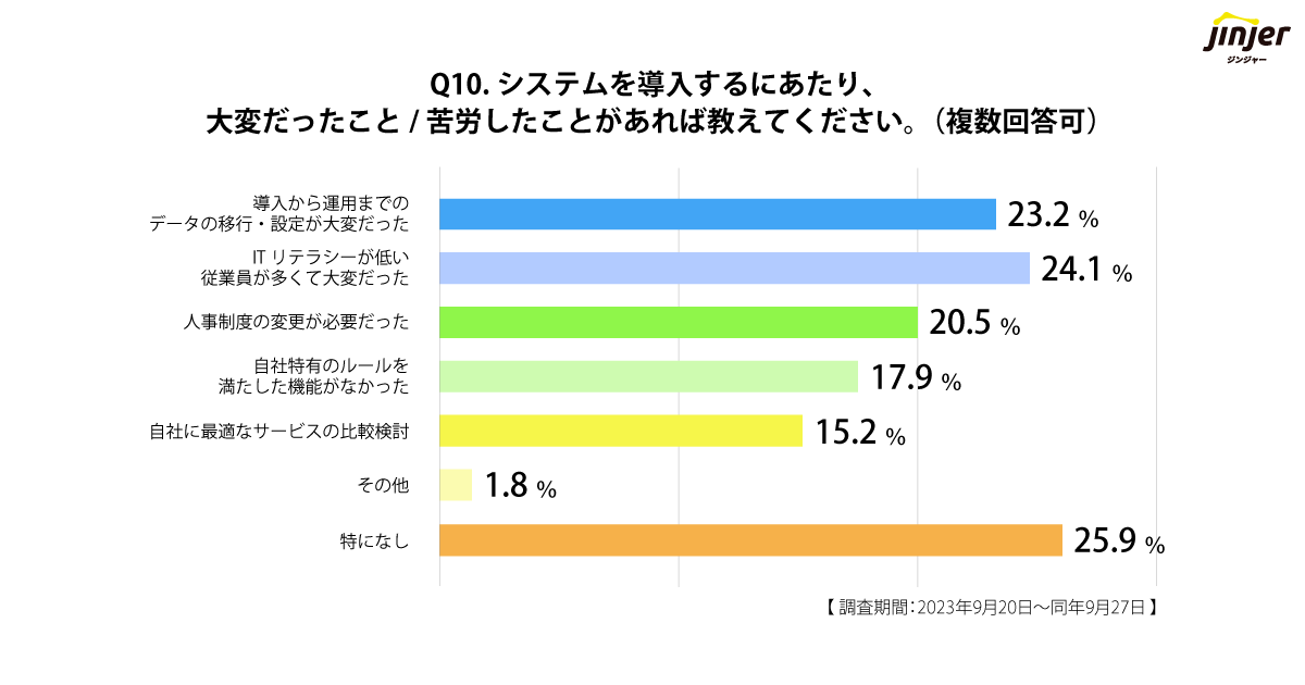 「システムを導入するにあたり、大変だったこと/苦労したこと」について質問したところ、上位3つの課題として「ITリテラシーが低い従業員が多くて大変だった」(24.1%)、「導入から運用までのデータの移行・設定が大変だった」(23.2%)、「人事制度の変更が必要だった」(20.5%)が挙がりました。