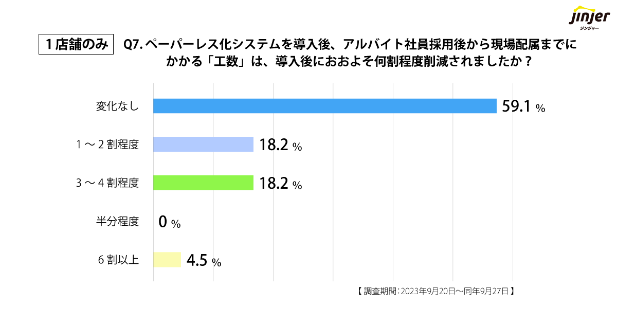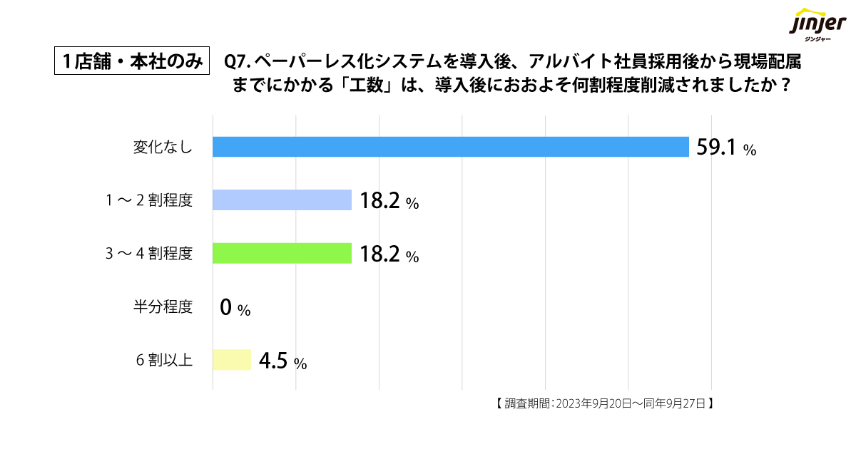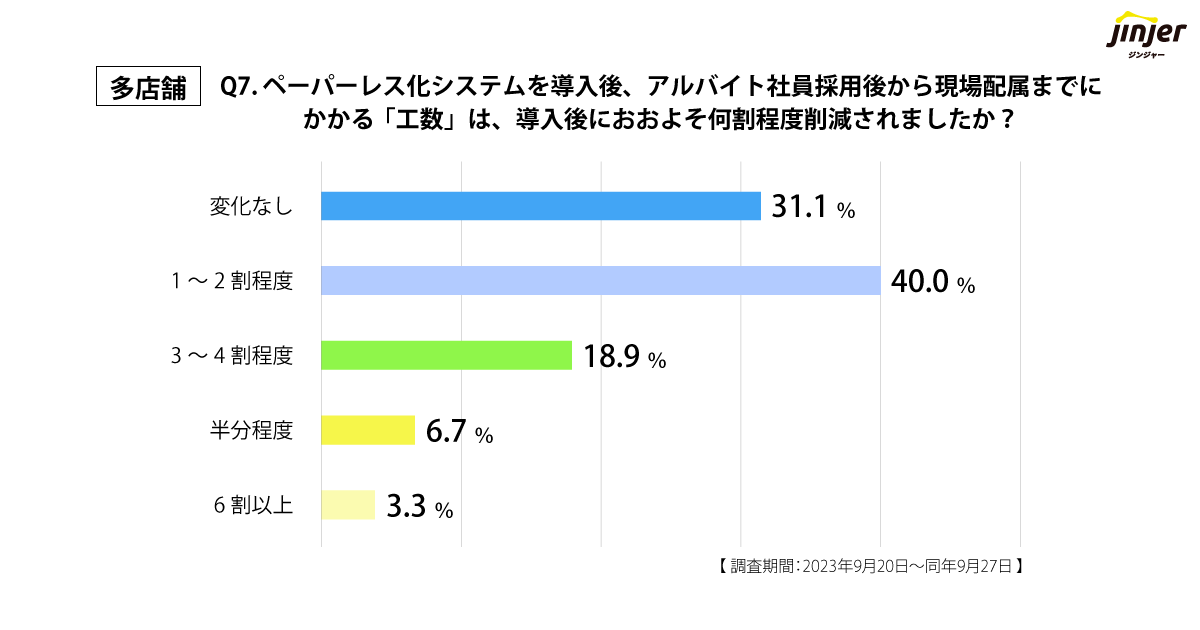 また、減少した工数に関しては、多店舗展開をおこなう企業の方が、1店舗のみ経営している企業に比べ28%効果があったとする回答が多く得られました。