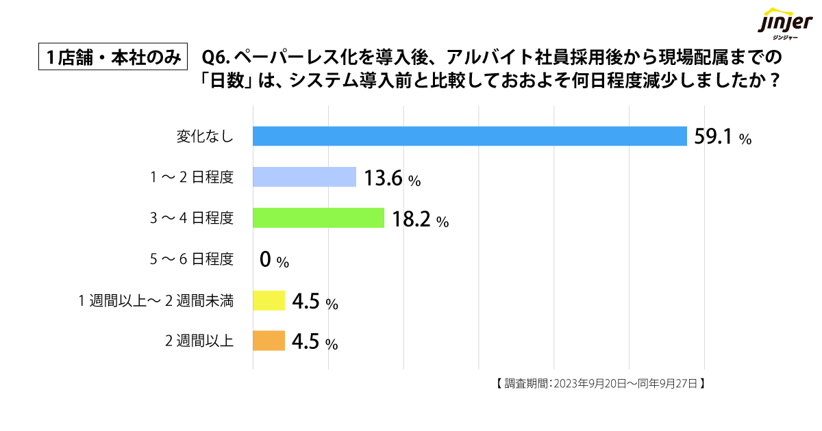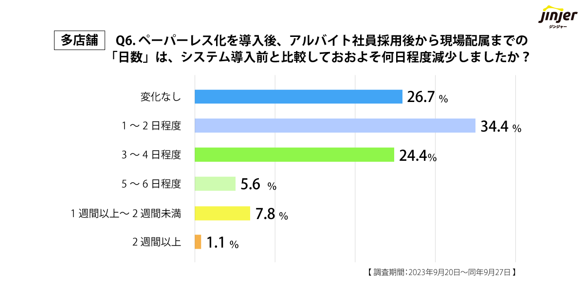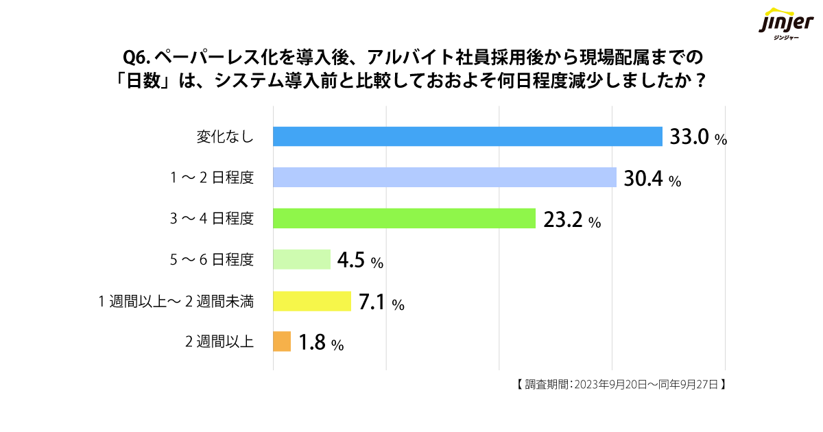 「人事管理・雇用契約のシステムを導入後の、アルバイト採用後から現場配属までの日数の減少具合」について質問したところ、「変化なし」と回答したのは全体の33%に留まり、67%が日数の減少を感じていることが明らかになりました。また、削減した日数として、最も多かった回答は「1~2日程度」でした。