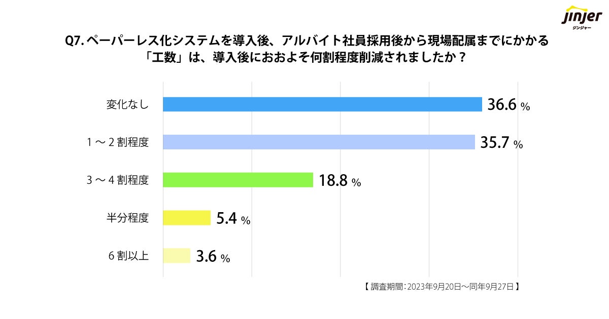 また、「人事管理・雇用契約のシステムを導入後の工数の減少具合」について質問したところ、「変化なし」と回答したのは36.6%に留まり、全体の63.4%の人事担当者が工数の削減を感じているという結果になりました。また、削減した工数の割合として、最も多かった回答は「1~2割程度」でした。