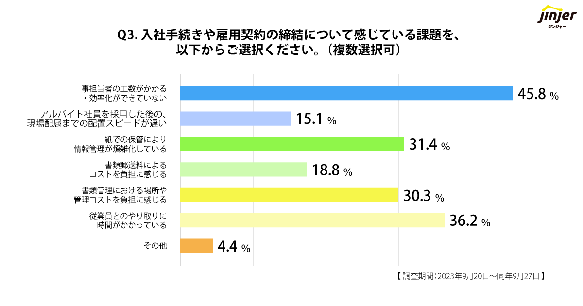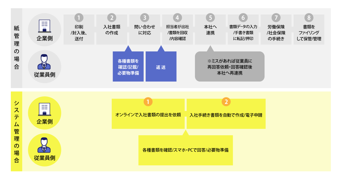 そのため、「即座に雇用契約を締結し、スムーズにシフトに組み込みたいのに、入社手続きに時間がかかることがある」「書類の不備によってプロセスが遅れ、貴重な時間と手間が浪費されることがある」という課題が顕在化しやすい環境にあると言えます。