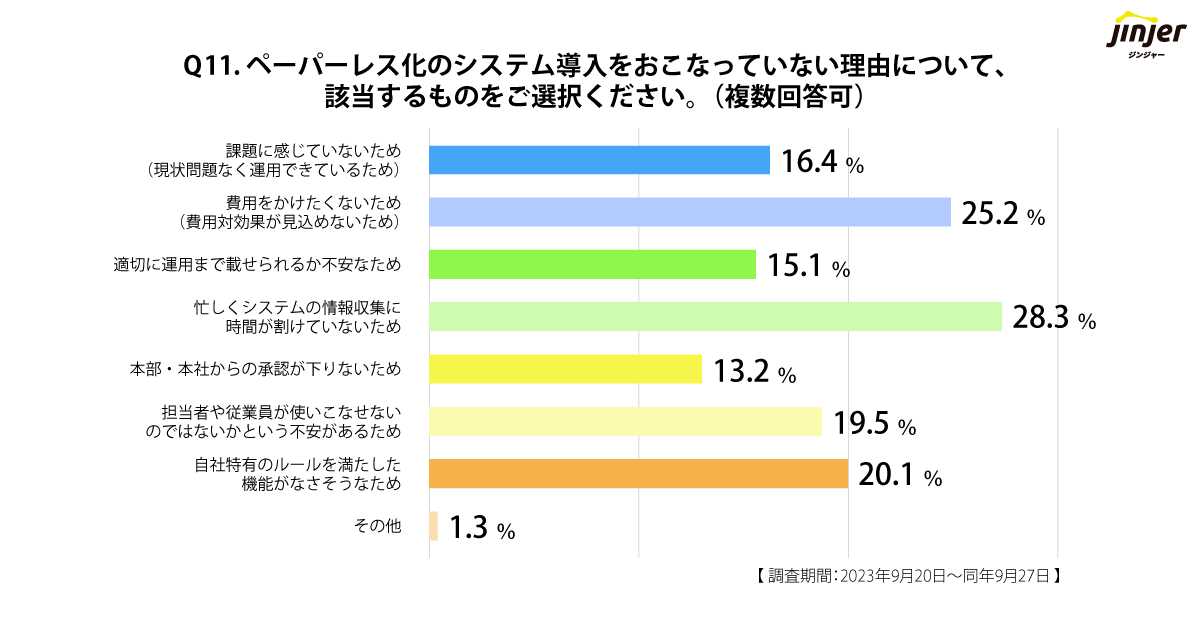 1店舗に比べて、多店舗展開を行っている企業の方が、約30%もペーパーレス化の効果を感じているという結果に。