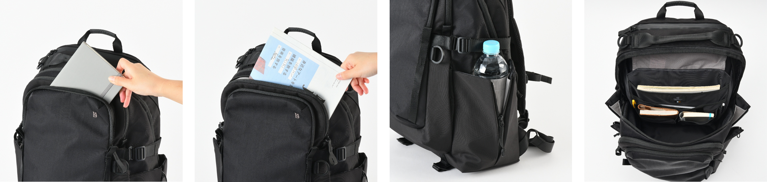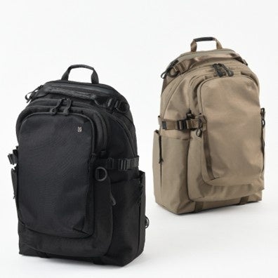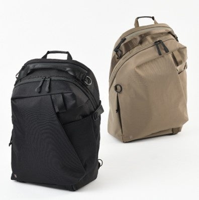 トレンチコートに見られるベルトや生地の重なりの構造をヒントに、ディテールを重視して設計されたタクティカルなバックパック。 前面やサイド、内装に計12個の多機能ポケットを配置し、15インチPC スリーブや、ファスナー引手付近の丸カンによるパドロック(南京錠)対応など、高い収納力とセキュリティ性を兼ね備えています。 高い機能性と収納性、洗練された構造美を実現したバックパックです。