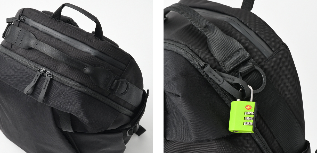 前面やサイド、内装に計13個の多機能ポケットを配置。15インチPCスリーブや、ファスナー引手付近の丸カンによるパドロック(南京錠)対応など、高い収納力とセキュリティ性を兼ね備えています。