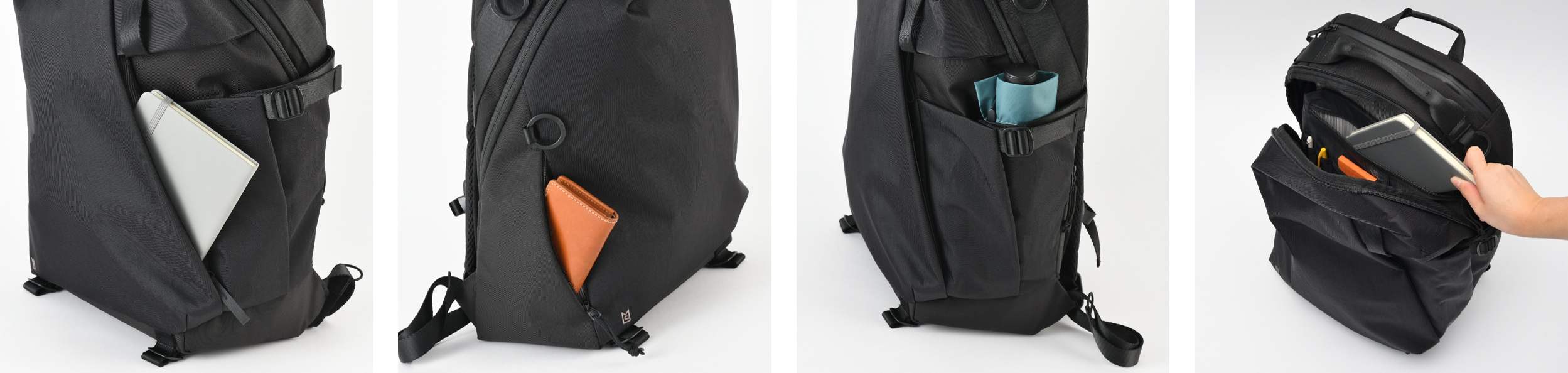 表側に5個、背面に1個、内装には15インチのノートPCが収納できるスリーブポケットを含め7個を配置。サイズの違う多機能ポケットを13個搭載したことにより、高い収納力を実現しました。