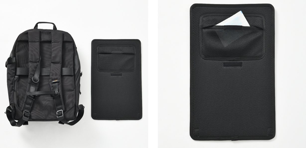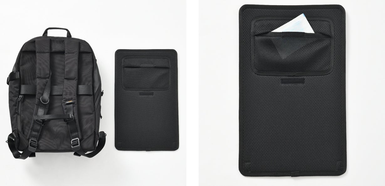 背面には着脱式メッシュパッドを装備。汗や汚れが気になる際は取り外して洗え、上部ポケットに保冷剤を収納でき る仕様に。パッドを取り外すことでバッグ本体の軽量化も可能。