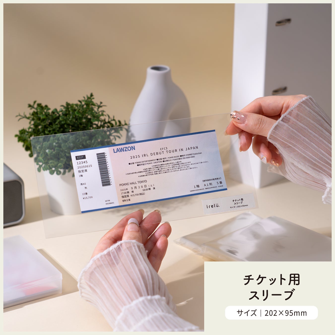 同時に発売される「irelu スリーブ」シリーズには、「クリアファイル用」「チケット用」「ポストカード用」の3種類が発売されます。いずれもグッズに適した厚みを考慮し、高透明のOPP素材を使用することで、グッズの色彩や細部を損なうことなく保護します。