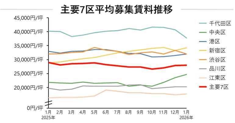 主要7区の平均募集賃料は28,002円/坪で前月比+58円/坪。