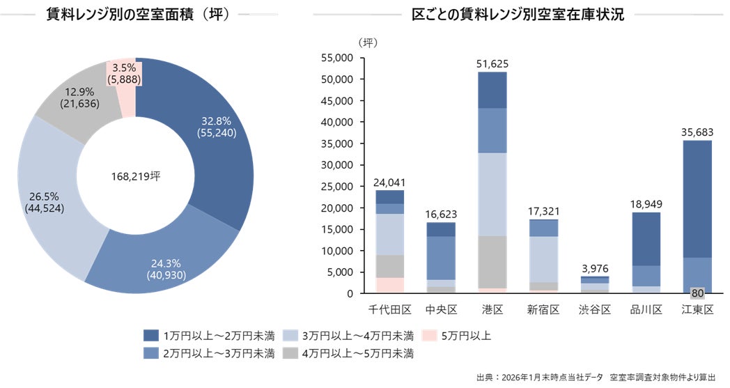 主要7区全体の空室面積の合計約16.8万坪のうち坪1万円台での募集が33%で最多、次いで坪3万円台での募集が続く。最多の空室を抱える港区(約5.1万坪)が中高価格帯中心であるのに対し、2位の江東区の空室は低価格帯が大半で、エリアによって空室量だけでなく価格帯にも顕著な差が見られる。