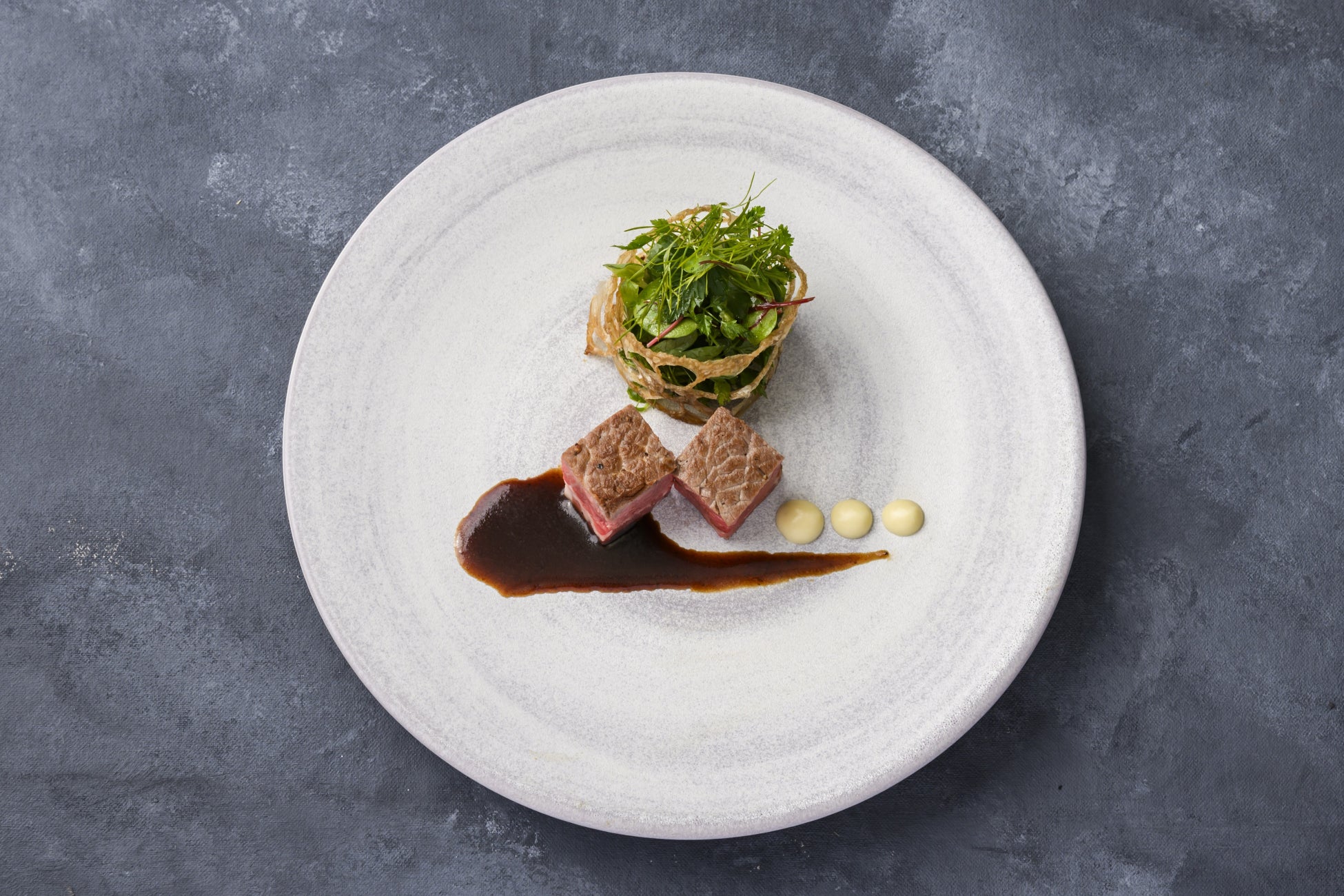 旨味が凝縮されたブランド和牛「能登牛」をサイコロステーキにし、香ばしく素揚げした蓮根でハーブサラダを包んでご提供いたします。ソースは、銀杏とにんにくの香るアイオリソースと、コク深い自家製デミグラスソース。風味豊かな二種類のソースが能登牛の上質な旨味を一層引き立てます。