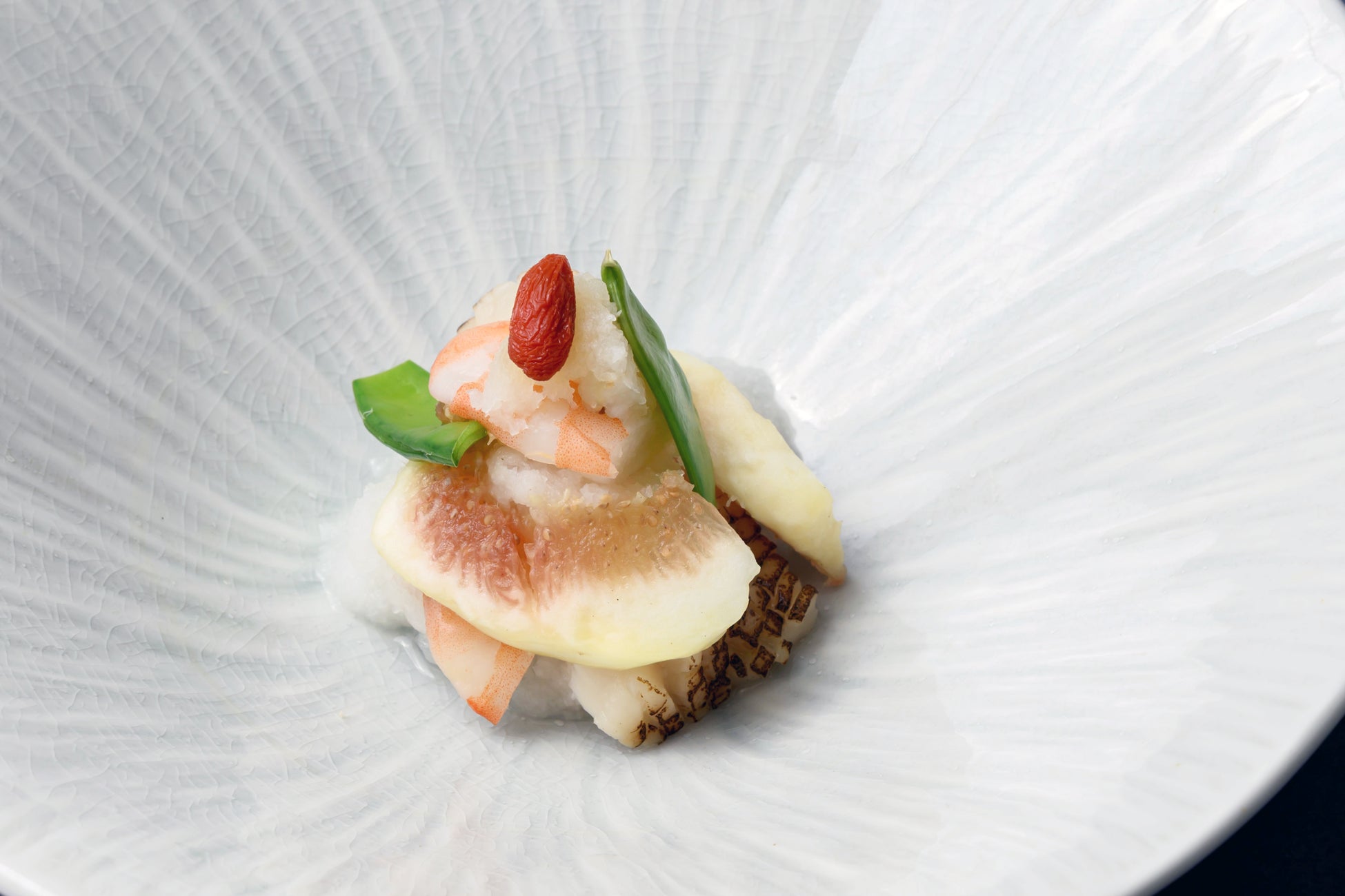 新鮮な車海老に、旬の果実を贅沢に合わせた一品。瑞々しい果実の自然な甘みと、大根おろしの清涼感が絶妙に調和し、口に運ぶたびに秋らしい爽やかさが広がります。