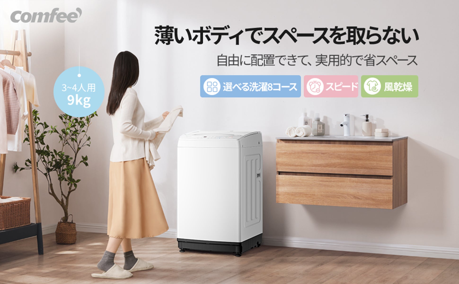 COMFEE’ 洗濯機 9kg 選べるブラック&ホワイト 透明ガラスドアのおしゃれデザイン 大容量でまとめ洗いも楽々 予約機能&スピード洗浄で時短 風乾燥&槽洗浄でいつも清潔 3~4人家族に最適!