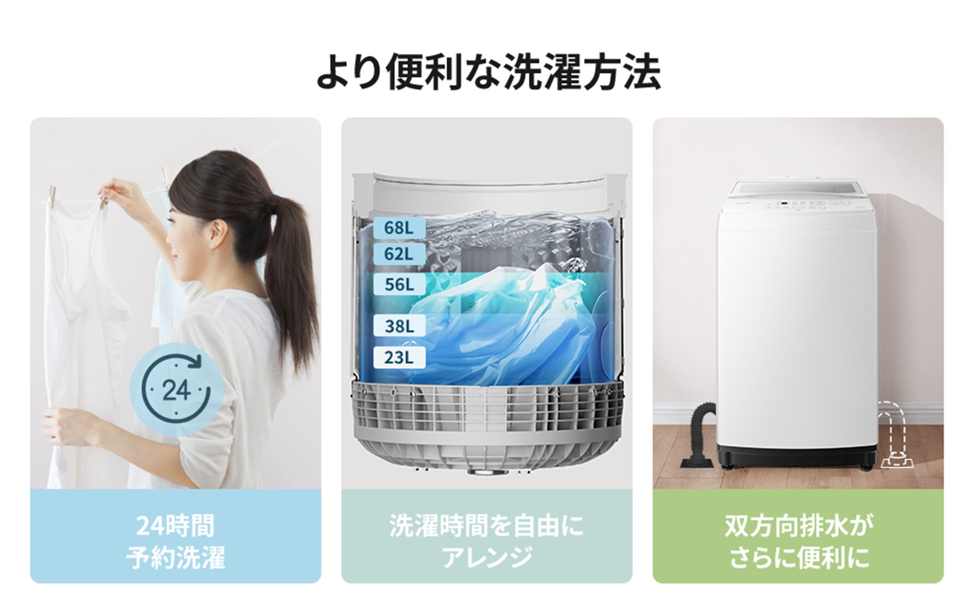 この洗濯機は、スケジュールに合わせてタイマー予約ができ、朝起きた時や帰宅した時など、自分の生活スタイルに合わせて洗濯を行うことができます。洗濯時間を自由に調整できるため、急いでいる時や余裕がある時でも柔軟に対応可能です。さらに、双方向排水機能が備わっており、排水が簡単で便利。洗濯後はスムーズに水を排出できるため、洗濯作業全体を効率よく行えます。これにより、忙しい日常生活でも時間と手間を節約し、より快適な洗濯体験を提供します。
