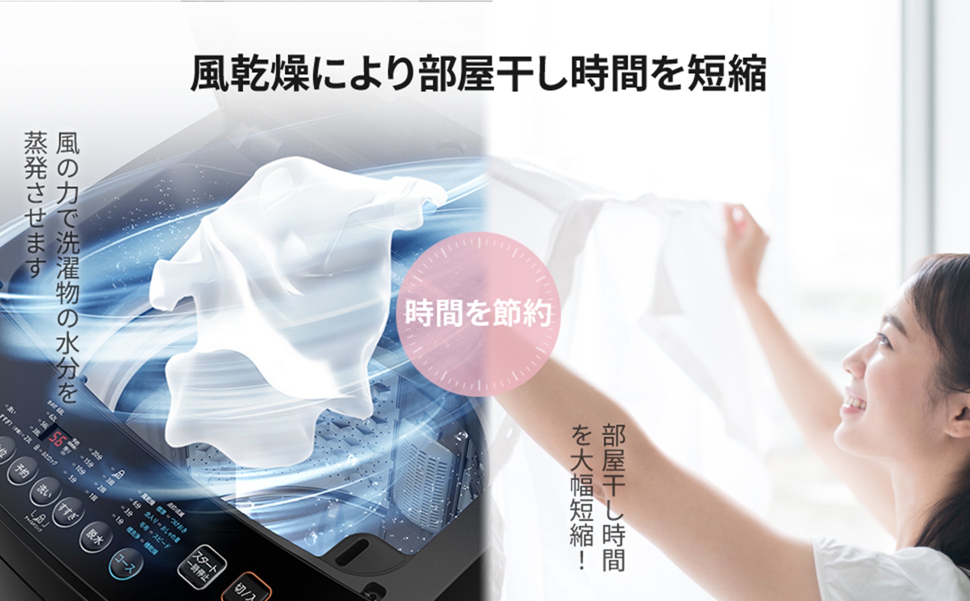 この洗濯機の風乾燥機能は、ヒーターを使用せず、脱水槽の遠心力と通風口から取り込んだ空気で衣類を高速回転しながら乾燥させるため、部屋干しの乾燥時間を大幅に短縮できます。エネルギー効率が高く、電気代の節約にも貢献します。また、衣類の柔軟性や風合いを損なうことなく、清潔でフレッシュな状態に仕上がります。従来の乾燥機と異なり、ヒーターを使わないため、省エネで環境にも優しい設計です。