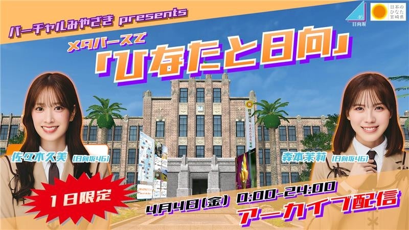 令和7年3月17日(月)に実施された生配信イベント「バーチャルみやざきpresents メタバースで『ひなたと日向』」では、みやざき大使である日向坂46の佐々木久美さんと森本茉莉さんが出演し、宮崎県の魅力を楽しくお届けしています。
