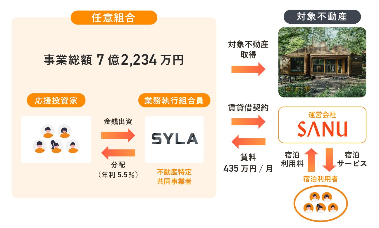 本ファンドは、山梨県北杜市南アルプスエリアに位置する宿泊施設(宿泊棟12棟+管理棟の合計13棟)を対象とした運用型ファンドです。これまで多くの支持を集めた開発型ファンド「第1期 SANU 2nd Home 南アルプス1st」「第2期 SANU 2nd Home 南アルプス1st」「第3期 SANU 2nd Home 南アルプス1st」により竣工した物件を、当初の計画どおり運用型ファンドへと移行する案件となります。