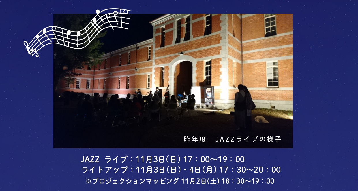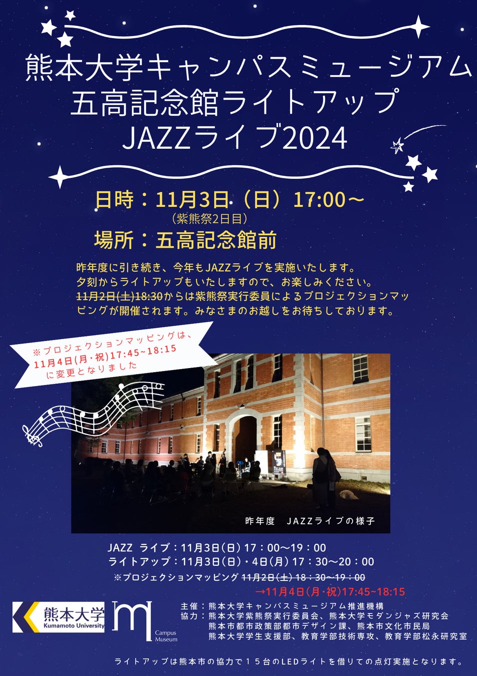 熊本大学では、キャンパス全体をミュージアム化し、地域の皆様にも訪れていただけるような活動を行っております。令和6年11月2日(金)から11月4日(月・祝)に開催される「第十三回紫熊祭」におきまして、昨年に引き続き、JAZZライブを開催いたします。重要文化財である五高記念館前で、夕暮れの美しいひとときを彩る「ジャズライブ」と「ライトアップ」をお楽しみいただけます。