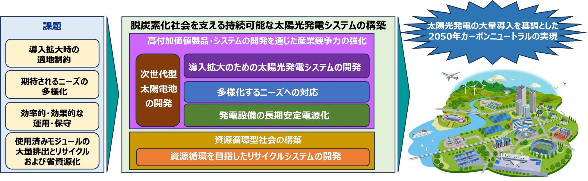 これらの課題解決にあたっては、高付加価値製品・システムの開発を通じた産業競争力強化の観点を踏まえた太陽光発電システムの開発、大量導入、設備維持と、資源循環社会の構築の観点を踏まえた少ない資源での製造、リサイクルなどを活用した資源の再利用、という二つの観点から、以下の五つの技術的方策を推進します。