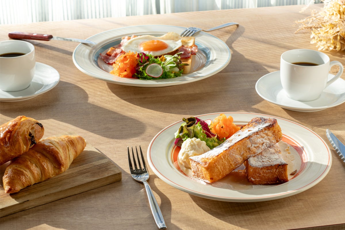 シンプルなトーストやエッグトーストなど約6種類からお好みのメインをお選びいただき、サラダ、パン、ヨーグルト、ドリンクはビュッフェ形式でお好みのものをお好きなだけ。 |