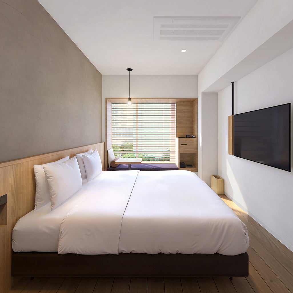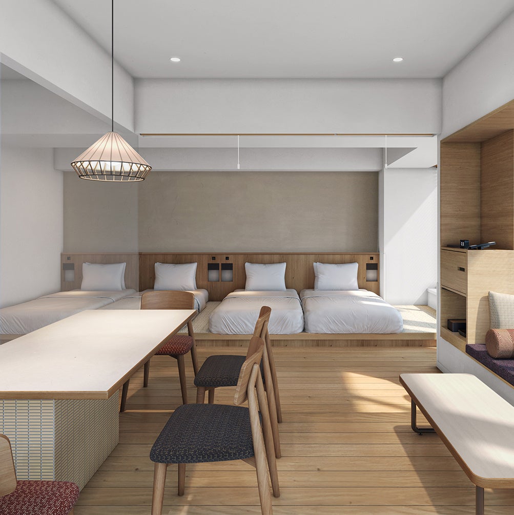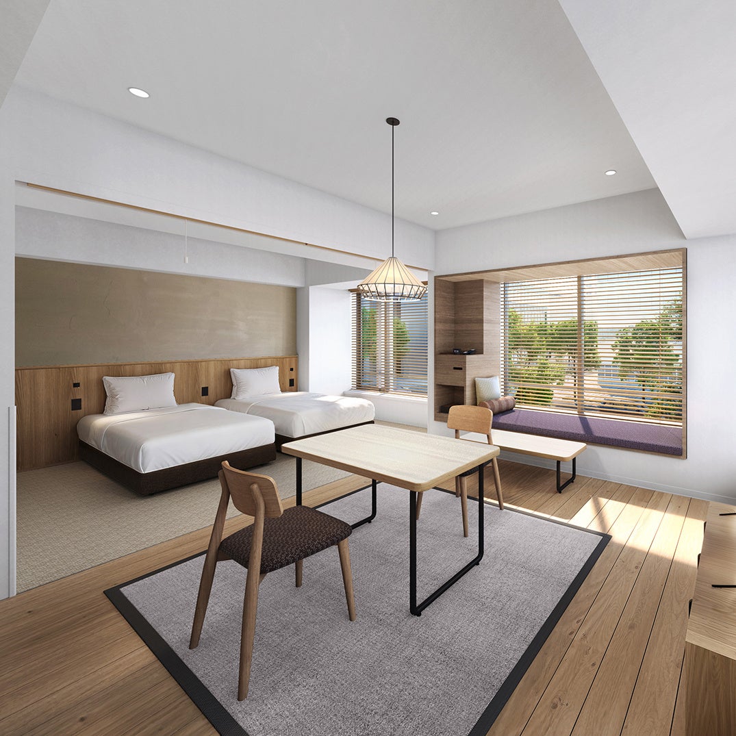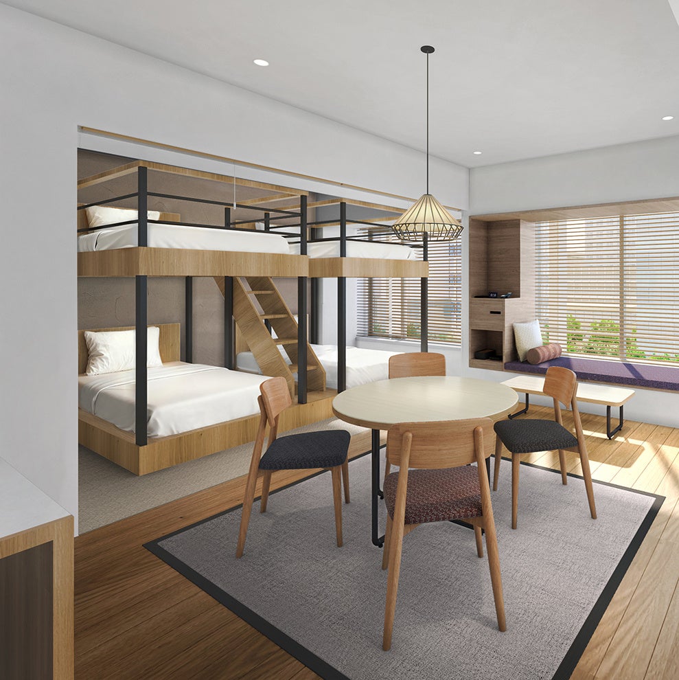 全56室7タイプのゲストルームは全室浴室・トイレ・洗面台がそれぞれ独立した造りとなっており、増加傾向にあるインバウンドや、ファミリー層、グループ旅行等のニーズに適した54㎡の広々としたフォースルームを設置し既存ホテルでは対応できなかった新しい需要を創造いたします。 ゲストルーム内にはミニキッチン(コンロ無し)や電子レンジ、72Lの冷蔵冷凍庫、食器類やカトラリーを完備しているためお部屋でゆっくりお食事を楽しむ事ができます。