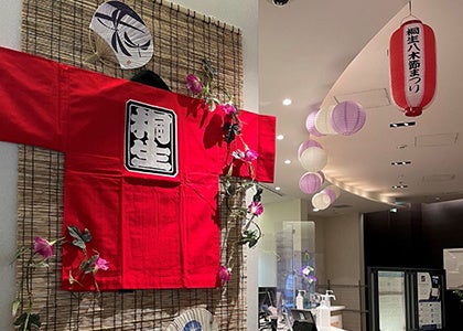 当ホテルが所在する銀座・有楽町エリアは、各都道府県のアンテナショップが集結するエリアで、中でも群馬県の「ぐんまちゃん家」は、ホテル玄関から徒歩30秒のご近所です。ホテルにお越しいただくお客様に、非日常の空間と夏らしい楽しい雰囲気を味わっていただきたいという思いから、群馬県桐生市ご協力のもと、毎年8月に行われている桐生八木節まつりの八木節踊りで使用される菅笠、唐傘、花笠などをホテルロビーに展示いたします。