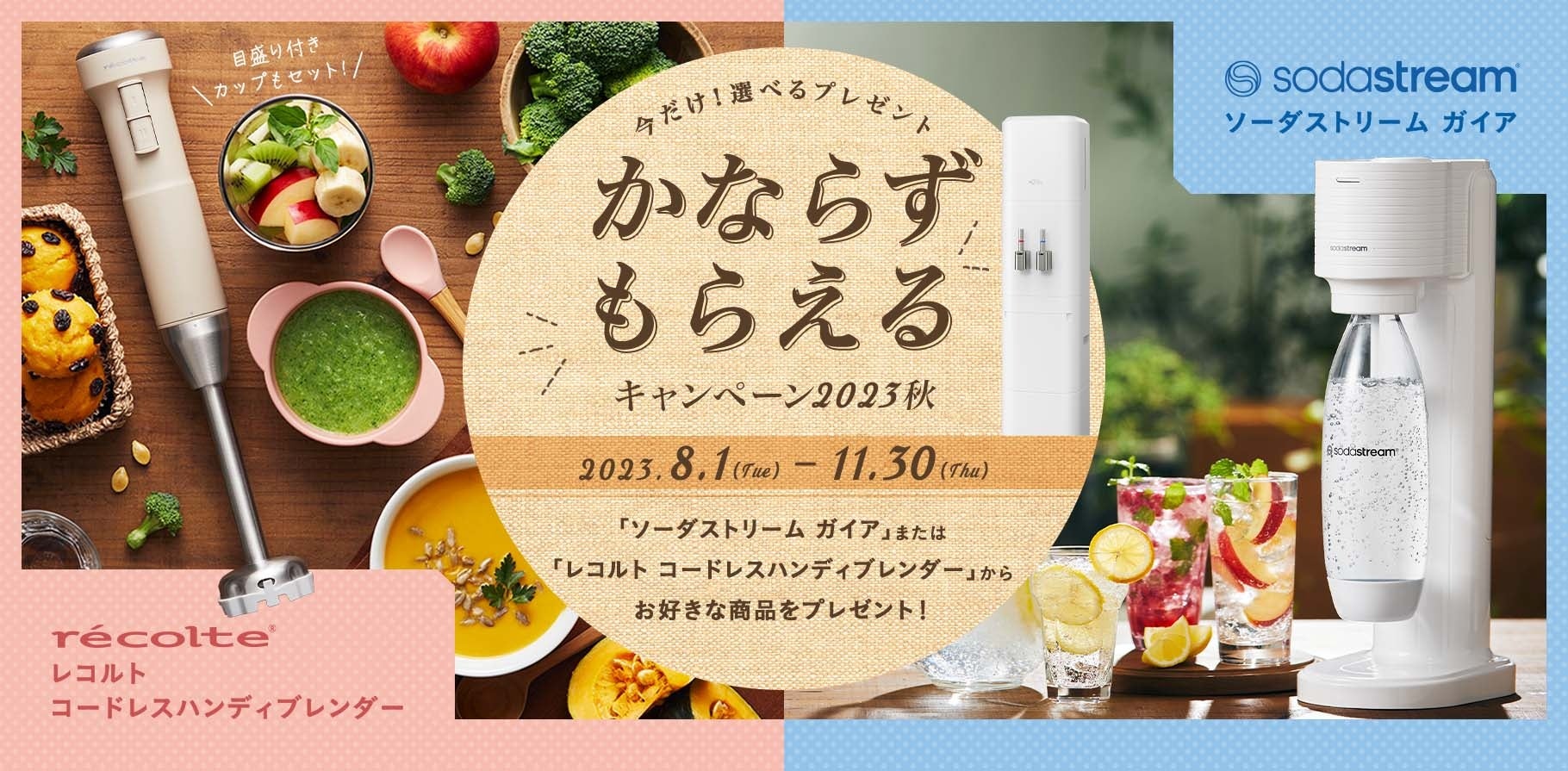 「ソーダストリーム ガイア」または「レコルト コードレスハンディブレンダー」からお好きな商品いずれかをもれなくプレゼント