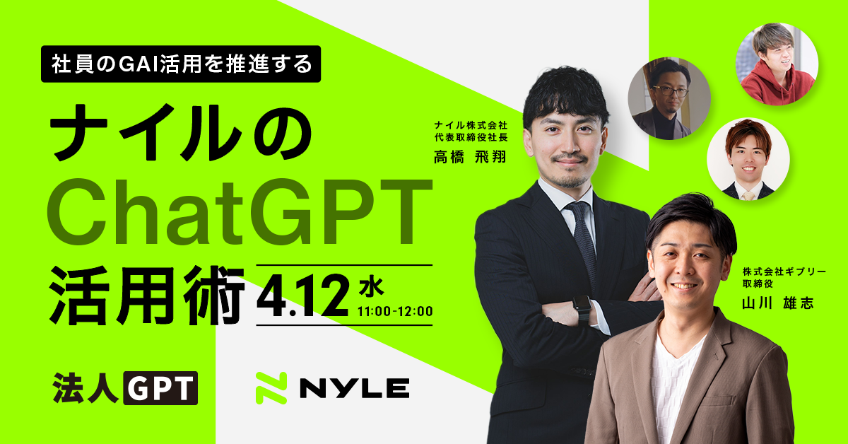 AIチャットボット、AI-FAQなどの業務自動化ソリューションを提供する株式会社ギブリー(本社:東京都渋谷区、代表取締役社長:井手高志、以下ギブリー)は、マーケティングDX事業、自動車産業DX事業を運営するナイル株式会社(本社:東京都品川区、 代表取締役社長:高橋飛翔、 以下ナイル)の高橋飛翔氏を迎え、社員のGAI活用を推進するナイルの「ChatGPT活用術」について語るオンラインウェビナーを、2023年4月12日(水)に開催いたします。