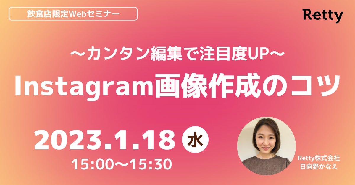 実名口コミグルメサービス「Retty」を運営するRetty株式会社(本社:東京都港区、代表取締役:武田 和也、以下Retty)は、飲食店向けWebセミナー「〜カンタン編集で注目度UP〜Instagram画像作成のコツ」を1月18日(水)15:00〜15:30で開催します。Rettyは飲食店のみなさまがよりよい集客を実現し、Happyな食体験を生み続けられるようサポートしてまいります。