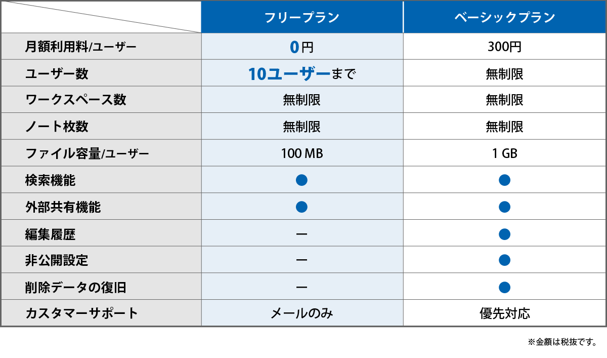最大10ユーザーまで無料の「フリープラン」は、チームやプロジェクトのリーダーに大変好評です。