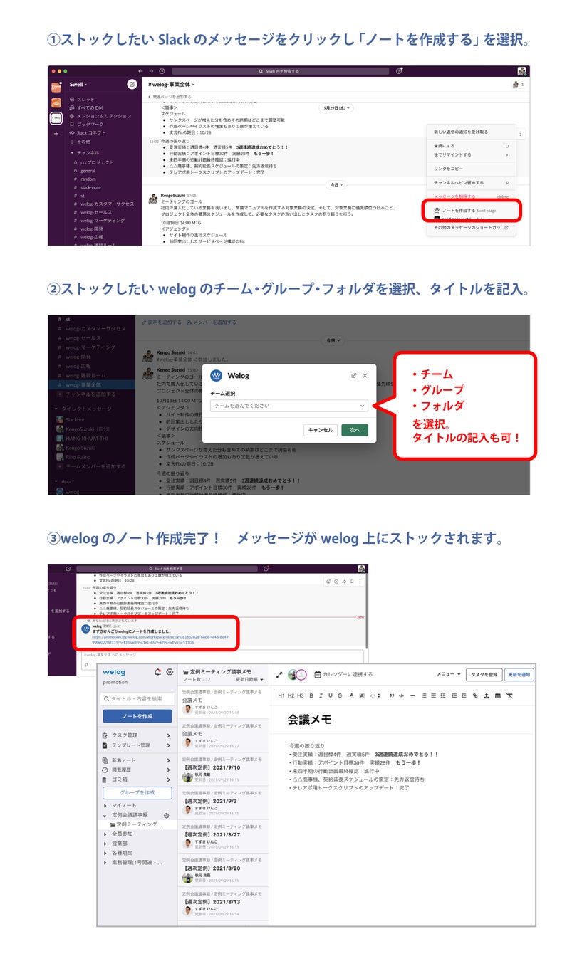 Slackのメッセージをwelog内に簡単な操作で保存可能! 「Slackのメッセージをwelogにコピー&ペーストする手間を省きたい」「Slack上で飛び交う日々のメッセージの中から、大切なものを逃さずストックしたい」といった要望を、今回のアップデートで解決しました。