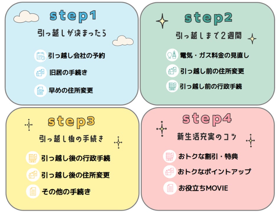 本サイトでは引越しに関する手続きや新生活を充実させるためのコツを、引越しが決まってから新生活をスタートするまでの4つのSTEPに沿って紹介しています。
