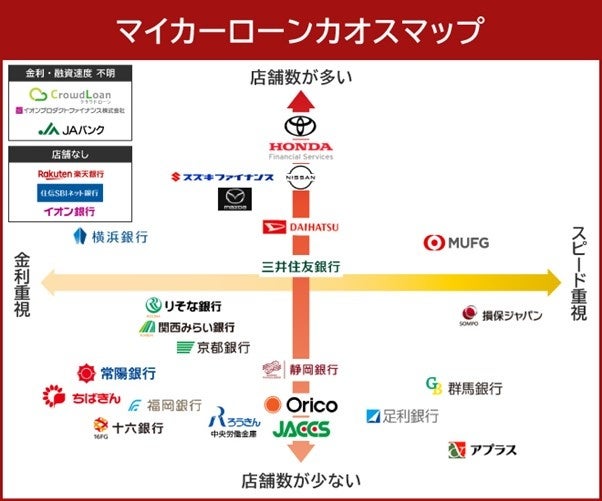 借入先の自由度が高まった今、借入先を金利だけに注目して選ぶのは難しくなっています。このような背景から、自分に合ったマイカーローンを選びたい、後悔しないマイカーローン選びをしたいという人に向けて、国内の主要なマイカーローンをまとめた「マイカーローンカオスマップ」を公開させていただくことにいたしました。