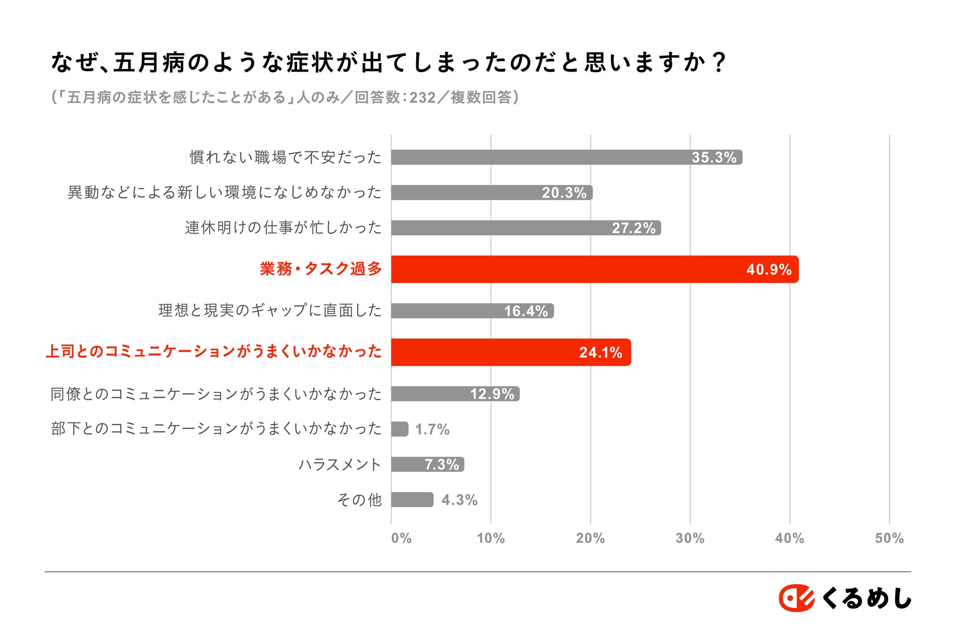 「五月病」の症状が出てしまった理由を聞くと、もっとも多い回答が「業務・タスク過多」で、その割合は40.9%にものぼりました。ついで「慣れない職場で不安だった(35.3%)」という回答がみられました。