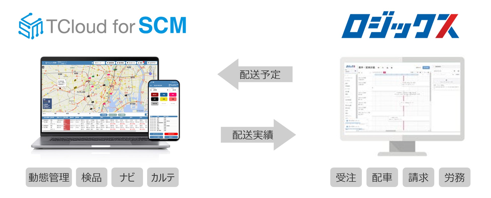 機能連携について開発を進め、現在、ロジックスの受注・配車・請求・労務情報を、TCloud for SCMへ取り込むことが可能となっています。今後、ロジックスへの配送実績の連携も行うことで、計画に対する運行実施状況の可視化や、実績入力の工程削減などにより、輸送管理プロセスの効率化の支援を一層強化します。