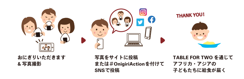 おにぎりアクションは、日本の代表的な食である「おにぎり」をシンボルに、「おにぎり」の写真をSNS(Facebook, Instagram, Twitter)、またはおにぎりアクションの特設サイトに投稿すると、1枚の写真投稿につき給食5食分に相当する寄付(100円)を協賛企業が提供し、アフリカ・アジアの子どもたちに給食をプレゼントできる取り組みです。2015年に開始してから2021年までの7年間の開催で、累計約125万枚の写真が投稿され、約680万食の給食を届けています。
