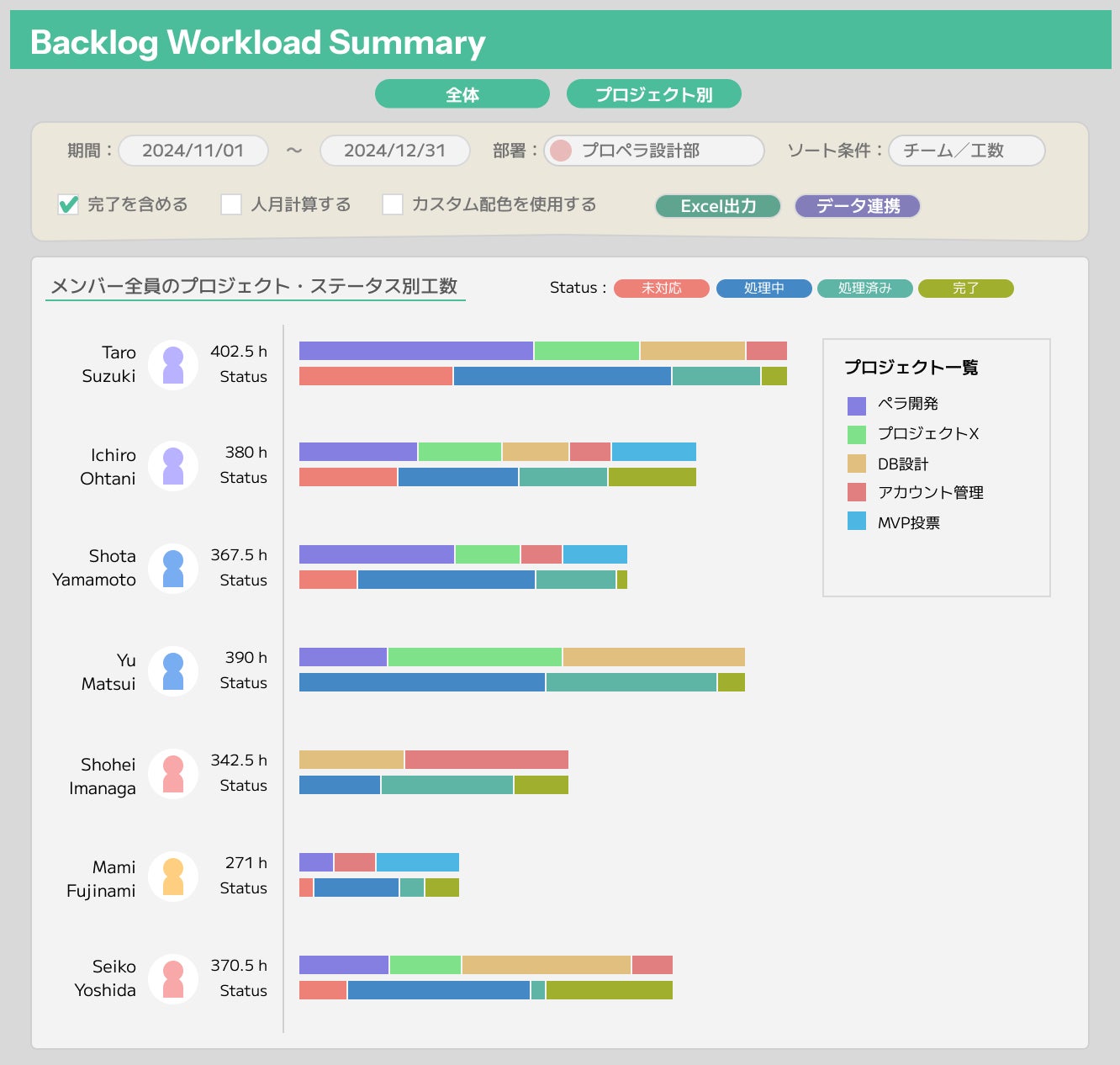 Backlogをさらに活用したいお客様にむけて、Backlogのデータを集計・集約して表示するカスタマイズです。