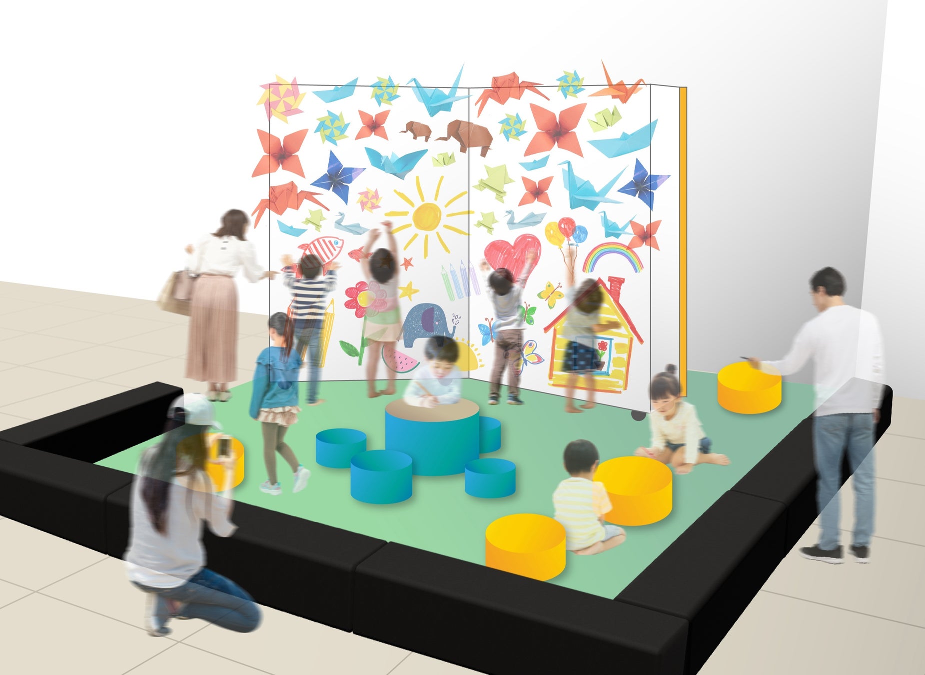 会場内にはキッズスペースをご用意しています。スペース内にある巨大絵本は、自由に書いたり、折り紙などを貼ったりできる特別な体験が可能です。「ヒカリのおうち」の塗り絵の他、「みんなが思い描く未来のエネルギー」を自由に表現してみましょう。