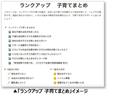 さらに、「育児プラットフォーム」の新たなコンテンツとして、「ランクアップ 子育てまとめ」を開始。現在子育てに奮闘する社員も今後子育てを希望する社員にも有益な情報を共有しあう場として活用します。
