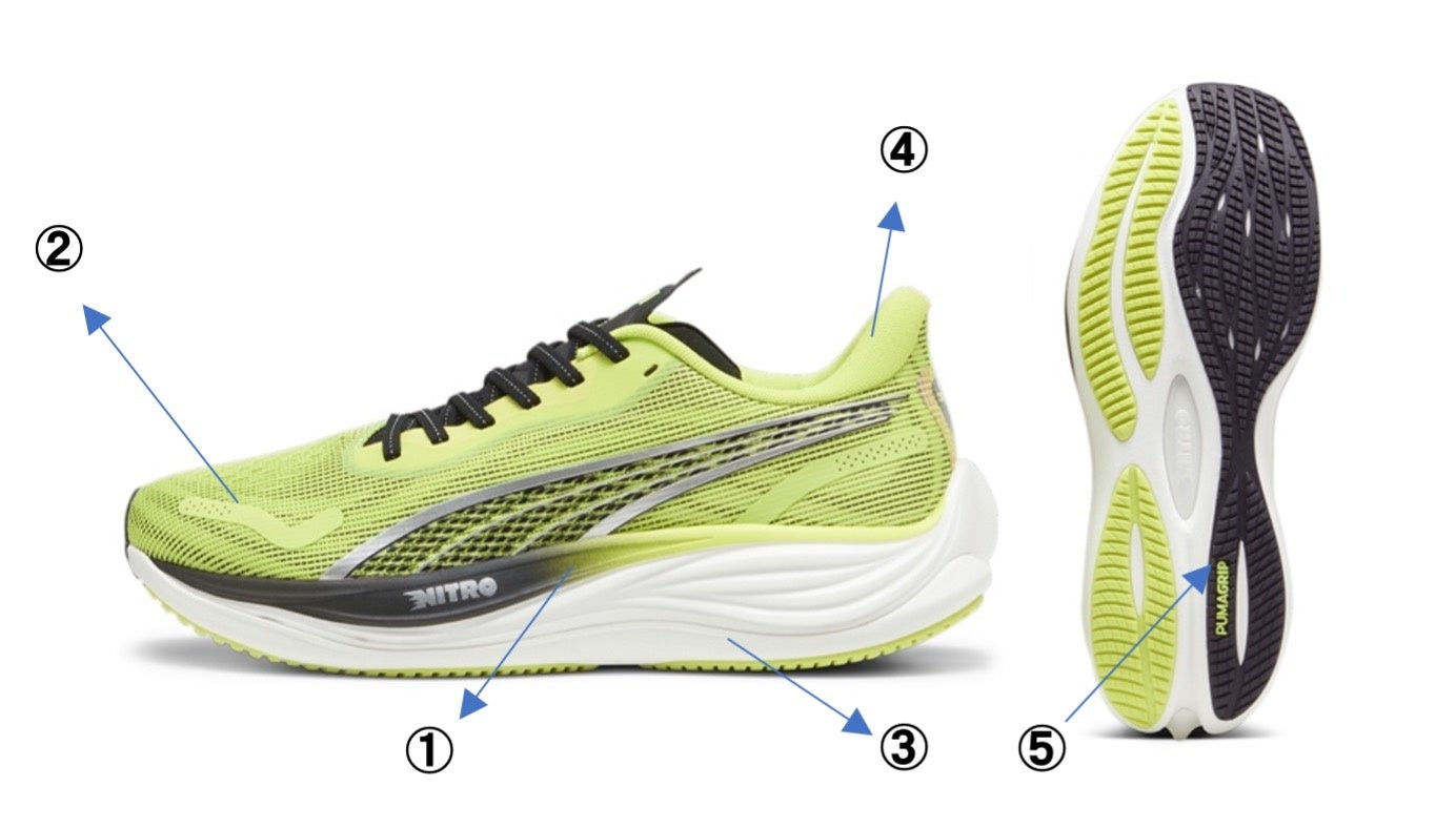 「Velocity NITROTM 3」は、爆発的な速さを提供するプーマ独自の革新的なテクノロジー「NITROFOAMTM(ニトロフォーム)」と硬クッションで安定性の高い「PROFOAMLITE(プロフォームライト)」を組み合わせソールが特徴のノンプレートランニングシューズです。これまでのモデルに比べNITROFOAMTMを2ミリ増量することにより、クッション性と安定性を兼ね備え、競技ランナーのジョグシューズからエントリーランナーのマラソンシューズまであらゆるランナーが弾む走りを体験できるシューズとなっています。