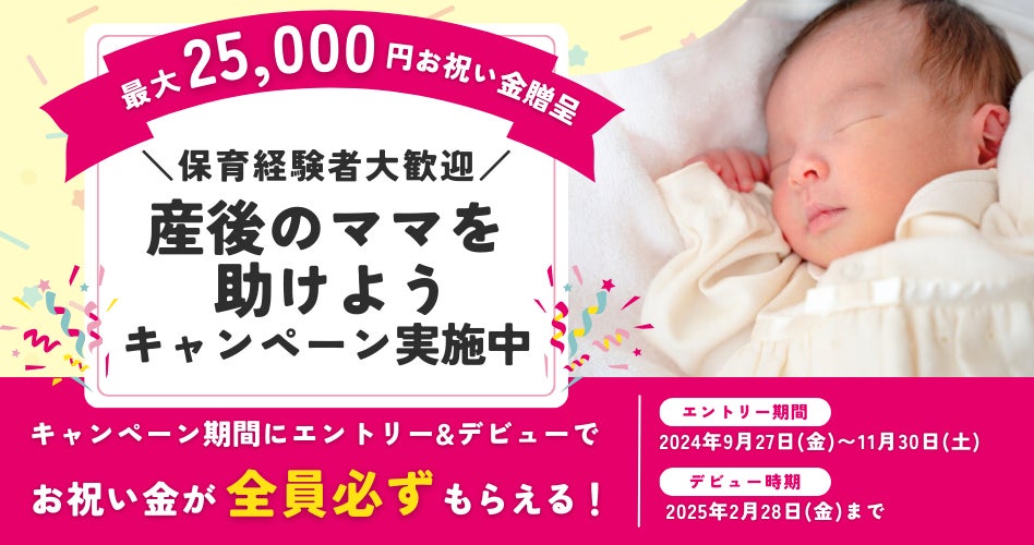 ■産後うつ予防■対策キャンペーン開始! 0歳児の保育経験者に最大2万5,000円のお祝い金!