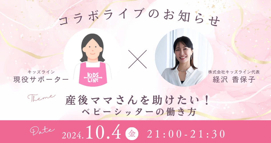 そこで、「0歳児ベビーシッターの仕事をもっと深く知りたい」という方に向けて、仕事のやりがい、副業としての可能性、収入面などをお伝えするため、10月4日(金)21時〜インスタライブを開催します。経沢香保子代表取締役と現役サポーターが登場し、リアルトークをお届けしますので、ぜひご視聴ください。