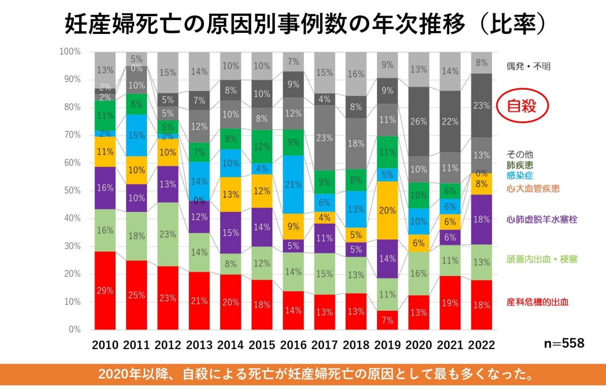 2024年7月10日に「日本産婦人科医会」および「いのち支える自殺対策推進センター」が発表した資料によると、2020年以降の妊産婦死亡原因の1位が自殺であり、2021年、2022年もその傾向が続いています。