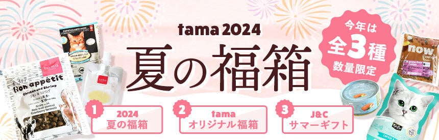 プレミアムキャットフード専門店・通販「たまのおねだり(tama)」(運営:マーケティングパートナー株式会社、本社所在地:東京都新宿区、代表取締役社長:権田真司、Tel:03-6772-8194、https://www.tamaone.jp/)は、7月9日(火)14時より「夏の福箱2024」の販売を開始いたします。日頃のご愛顧に感謝し、新商品やロングセラーアイテムなどをたっぷり詰め込んだ福袋、ならぬ「夏の福箱2024」として今回ご用意したのは「夏の福箱2024」「tama オリジナル福箱」「J&Cサマーギフト」の3種類。それぞれバラエティー豊かな商品をたっぷり詰め込んでいます。最大47%オフと大変お得なセットです。(「夏の福箱2024」は数量限定での提供となっており、なくなり次第販売終了となります)