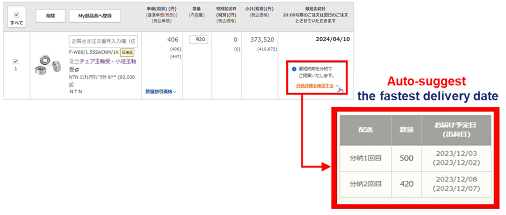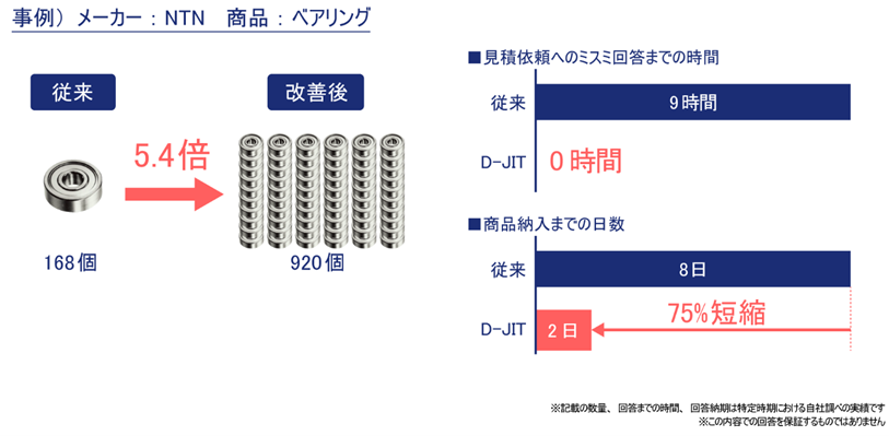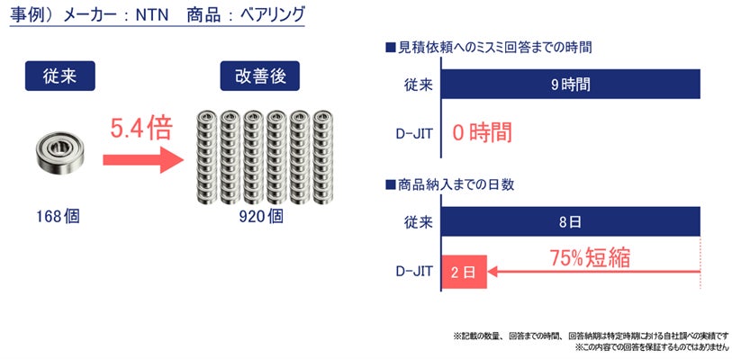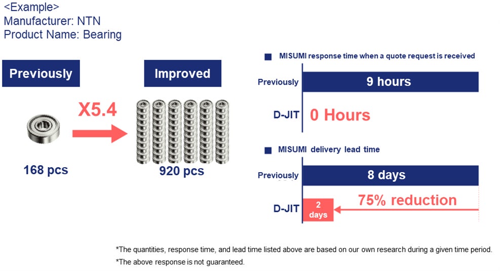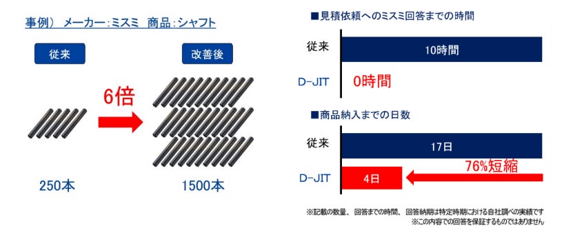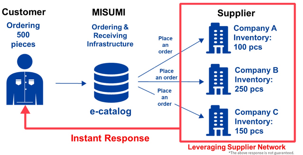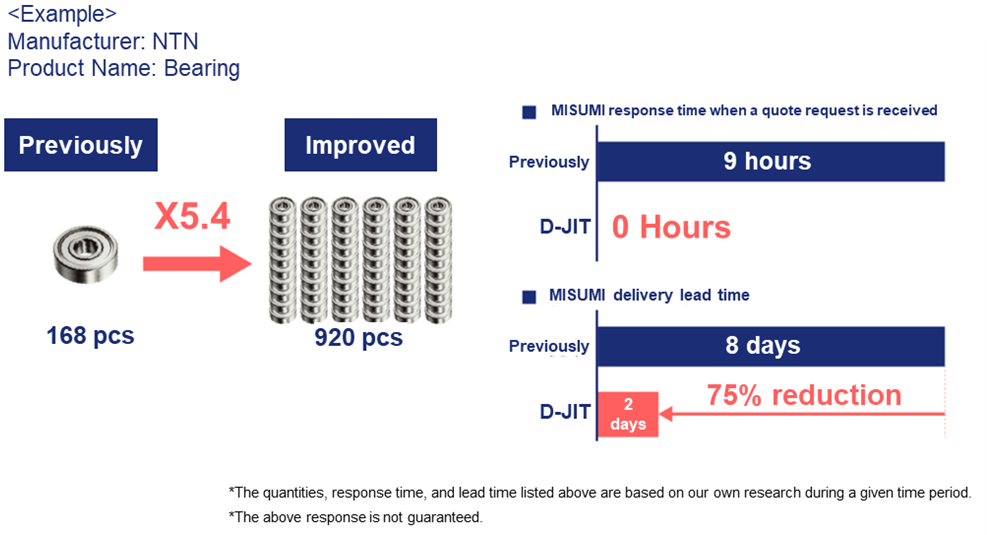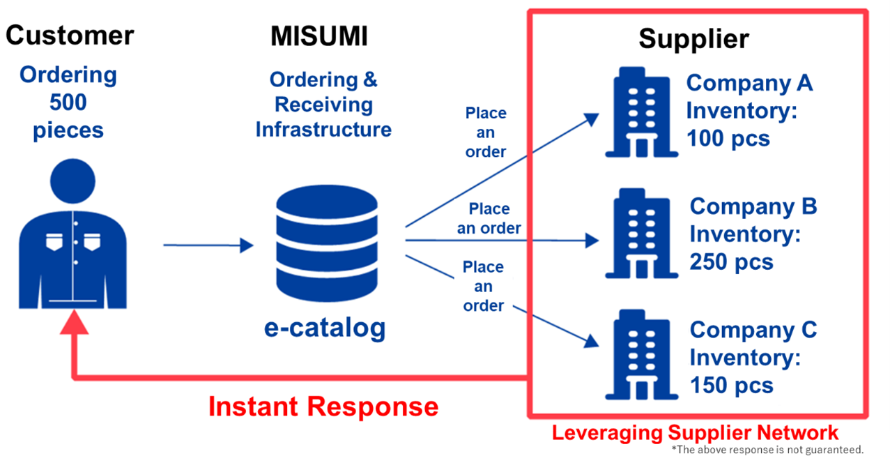 As a platformer with an extensive network of over 400 suppliers in and outside of Japan, D-JIT can solve this structural problem in the industry’s distribution by linking the suppliers’ inventories and factory production capacity. When a customer enters a desired quantity on MISUMI's e-commerce site, the inventory information of dispersed suppliers is immediately retrieved in real time to automatically display prices and the fastest delivery lead time. Customers can now make a one-stop purchase of “the products they want, in the quantities they want, on the dates they want” - simply by using the MISUMI e-commerce site as before.