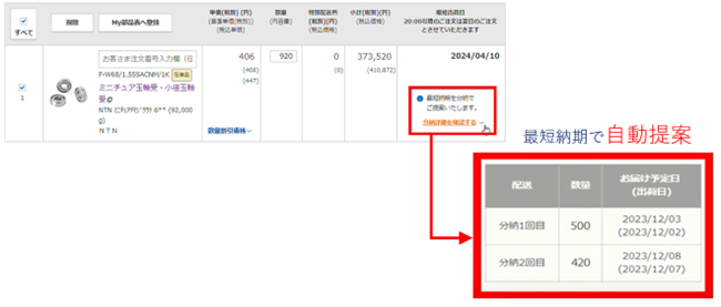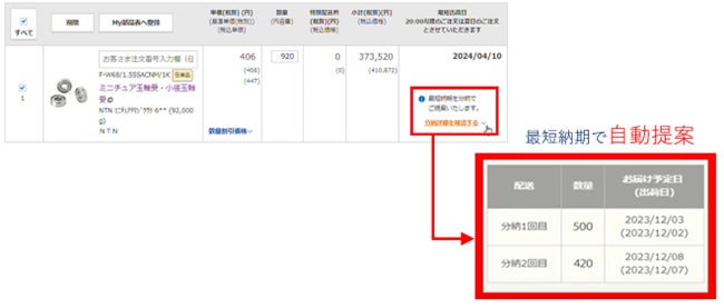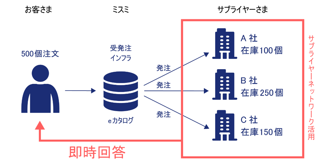 ミスミは、お客さまの希望数量に対し、世界中に点在する複数のサプライヤー在庫を瞬時に組み合わせ、価格と納期を自動で表示するアルゴリズムを開発。これによりミスミECサイト上でお客さまへ提供可能な数量も大幅に増加します。大口の購買需要の高まりや、世界的なサプライチェーンの不安定化を背景に、購買の長年の課題である「ほしい商品が、ほしい納期内に、ほしい数だけ揃わない」という状況を解消。部品を提供するメーカーさま・サプライヤーさまにとっても、利益向上、非効率の解消にもつながる、三方よしの新サービスです。