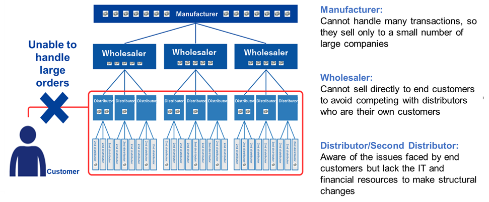 ③ 「代理店・二次店」は市場の問題を認識するも、在庫管理システム構築・運用のノウハウ・資金力が不足し、構造転換には至らず