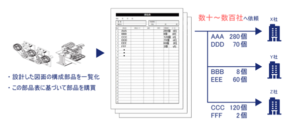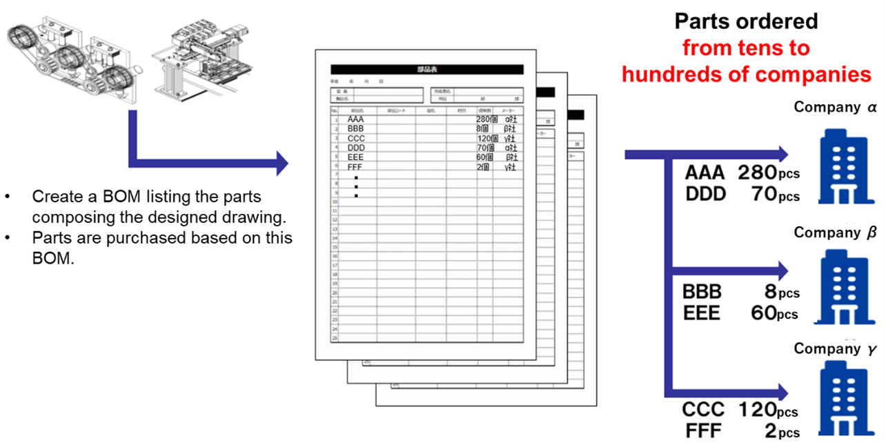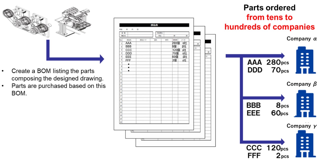 Automated equipment is essential to manufacturing, and its production process involves many steps from getting quotes to delivery. One of these steps is “parts purchasing” performed by the purchasing department - based on the equipment design, they create several hundred sheets of bills of materials (BoMs), specifying parts names, quantities, and manufacturers, to procure parts from dozens to hundreds of suppliers. Unfortunately, it is usually the case that several percent of the total number of parts cannot be sourced on the desired delivery date or in the desired quantity*2. If even one required part cannot be procured, the equipment cannot be manufactured, resulting in a tremendous amount of coordination, such as searching for parts from new suppliers or e-commerce sites. If the parts cannot be procured despite all these efforts, they will have to ask the design department to change the equipment design.