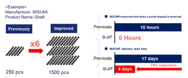MISUMI Group Inc. (Headquarters: Chiyoda-ku, Tokyo, Japan; Representative Director and President: Ryusei Ono) will begin full-scale operation of “D-JIT”*1, an innovative digital transformation of the purchasing process of industrial automation parts, on April 15, 2024. With an extensive network of over 400 suppliers in and outside of Japan, which is updated almost in real time, D-JIT can centralize information on their inventory status and factory production.