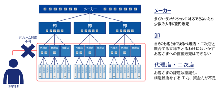 ② 「卸」は自らの顧客である代理店・二次店と競合するため、特定の一社への直販が出来ない