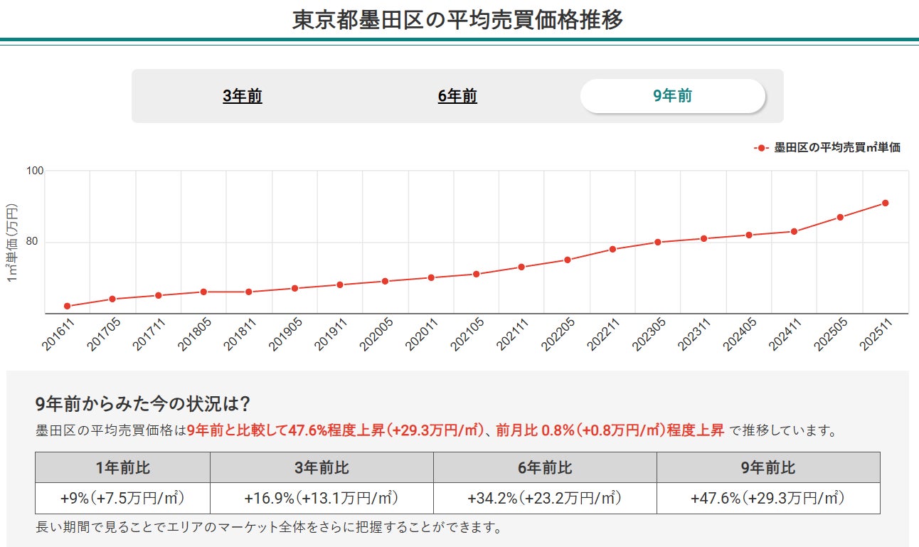 9年前と比較した平均売買価格は、墨田区47.6%、江戸川区48.1%、葛飾区58.5% の上昇となり、いずれも着実な価格上昇を示しています。